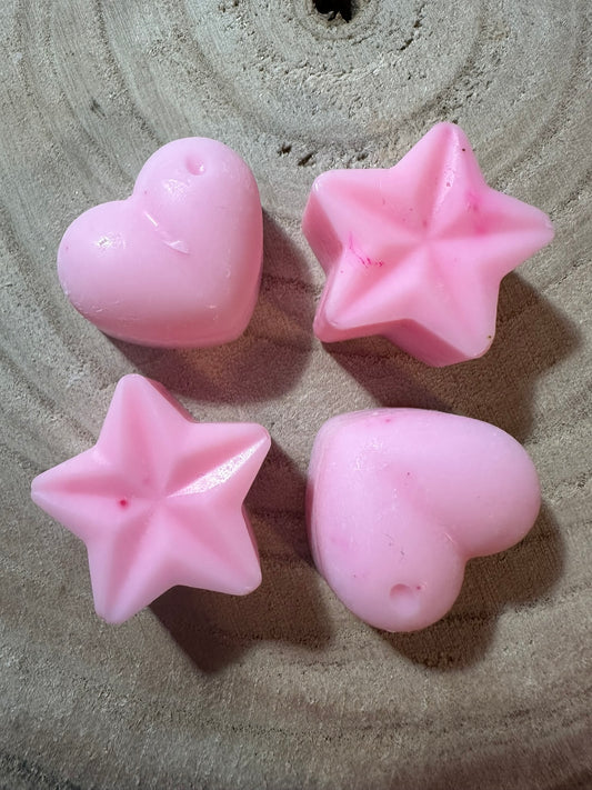 Our hearts & stars are approximately 30g in weight. These are a perfect way to sample new scents before committing to a larger bar. Burn time is approximately 12-16 hours, this depends how much is used at a time. 4 shapes in each pack!